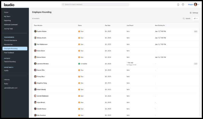 A: Anyone with access to the team member’s rounding data can complete a round, though this is typically done by the primary or direct manager.