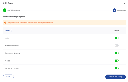 Adjust the Features and Team & Access settings for all users in the new group. Note that for any users within a group, the group settings will overwrite their individual feature settings.