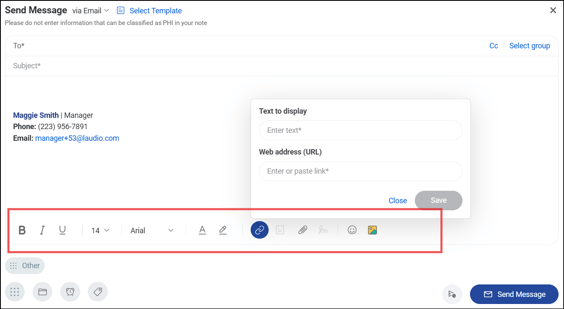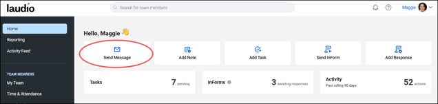 - Click Send message anywhere in the Laudio application. Options are available on your homepage and within most workflows.