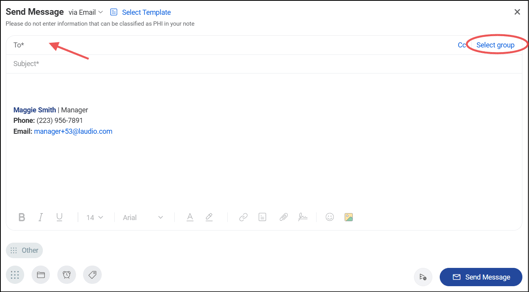 2. A message window will populate for you. Type the name of the employee you wish to message or use the "select group" option on the right side to select a subset of individuals or your entire team on Laudio.