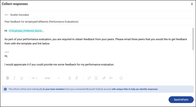 - Select the email icon to the right and an email message window will appear. The recipients name will be prepopulated along with a message and customized link to collect feedback. Hit Send InForm.