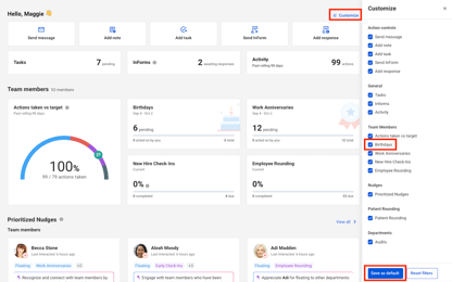 - Additional Reports and Filters for Patient Rounding. The Patient Rounding Dashboard now features visualizations for both “% of patients rounded on within 24 hrs of admission” and “% of patients rounded on within 24 hrs of discharge”. Additionally, users can now filter the dashboard page by departments, facilities, and scripts. These key enhancements help leaders understand best-practice process metrics, and drill down into the exact data insights they need to make more informed decisions.