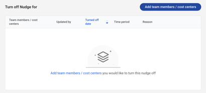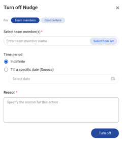 Use Snooze when a nudge is temporarily not actionable but may be helpful later. A Snoozed tag will display for that team member. Use Turn Off when a nudge is no longer relevant for your team.