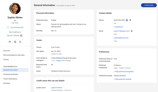 A: The information in these profiles comes from several sources and updates over time. Demographic data is synced from your HRIS system. General information such as preferences and hobbies is entered by you or collected through the profile questionnaire InForm. Professional details come from the Professional Engagement InForm, which can be sent to your team. The activity section tracks notes and actions in Laudio and can be exported to support reviews.