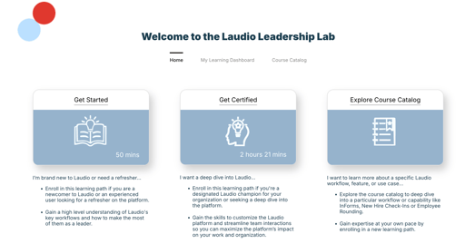 New Laudio Leaders – Click Home and enroll in the Laudio: Get Started learning path. Add more courses from Explore Laudio as needed.
