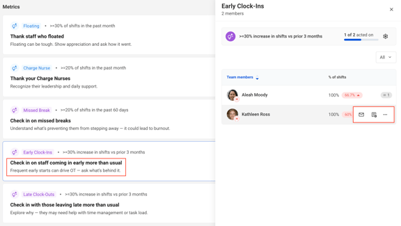 From each metric-based nudge, leaders can view all team members who fall into that category and choose how to engage with them. While emails and notes are sent one at a time to maintain authenticity, leaders are encouraged to reach out consistently across their team when it makes sense. You can take the following actions from any metric-based nudge: