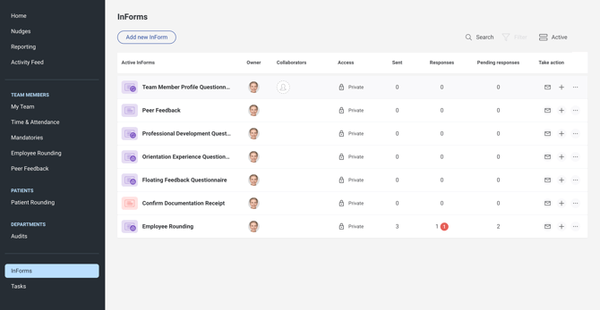 A: Not yet. The dashboard shows counts only. Use the employee profile or InForms page to view responses.